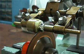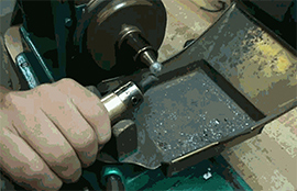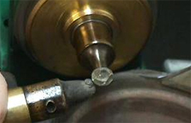 The smaller (7.56ct.) piece of rough is being bruted to obtain a circular outline. Notice an industrial diamond embedded at the end of a rod is applied to the rough as it rotates. Great care is taken so that the large inclusions in this piece does not expand or travel deeper into the rough.